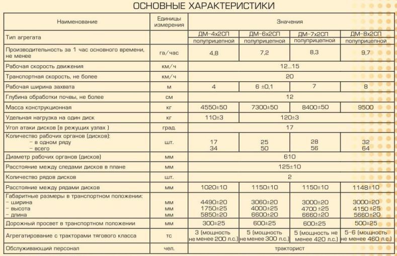 Диски изготовлены из борсодержащей стали ЗОМпВб. После закалки и отпуска сталь приобретает высокую прочность и твердость, которые обеспечивают повышенную эксплуатационную стойкость готовых изделий — их ресурс выше по сравнению с продукцией из стали 65Г. Нестандартное расположение каждого диска на индивидуальной подпружиненной стойке способствует улучшению агротехнических показателей обработки почвы, а также снижению тягового усилия трактора и ГСМ. Установка дисков на индивидуальных подпружиненных стойках исключает забивание междисковых пространств растительными остатками, и отпадает необходимость применения в конструкции чистиков. Диски благодаря такому креплению двигаются стабильно в почве без бокового отклонения. Еще одно преимущество такого крепления — надежная защита от перегрузок. Режущие узлы не обслуживаемые. Смазывания не требуется. Сдвоенные катки (трубчатый и пластинчатый) обеспечивают точность глубины обработки до 1 см с одновременным выравниванием и прикатыванием почвы. Ходовая тележка представляет собой сварную конструкцию из трубы с установленными на конических подшипниках ступицами колес. Агрегаты предназначены для работы на всех почвах с влажностью не более 23%, уклоном поверхности поля не более 102, твердостью почвы в обрабатываемом слое не более 3,0 МПа. Не допускается применение мульчировщиков на почвах, на которых имеются пни, корни деревьев и засоренность каменистыми включениями в объеме более 0,5%, размером свыше 100 мм. ДМ-6х2СП — Рама мульчировщика является основным несущим элементом конструкции и предназначена для установки на нее ходовой тележки, сцепного устройства, прикатывающих катков, режущих узлов, а также монтажа гидросистемы мульчировщика. Представляет собой сварную конструкцию из продольных брусьев и поперечных труб квадратного (120×120) сечения с кронштейнами для установки сцепного устройства, а также кронштейнами для установки прикатывающих катков и ходовой тележки. С нижней стороны поперечных труб имеются кронштейны для крепления режущих узлов. Мульчировщик также может комплектоваться спиральными катками. Гидравлическая система позволяет комбинированное плавное управление гидроцилиндрами сцепки и ходовой тележки при различных манипуляционных действиях. Агрегатирование с тракторами тягового класса 5 (Мощность не менее 420 л.с.)